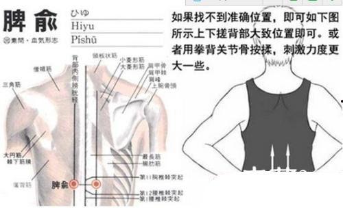 1. 找准穴位:首先,找到脾俞穴的位置,可以用手指沿着脊柱向下摸,找到第十一胸椎棘突下,再旁开1.5寸的地方。